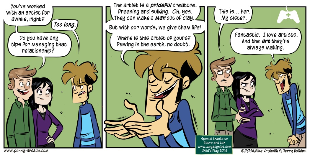 This all came out when we were trying to write todays's strip, as the faceless caricature we'd invented to torment my alter ego began to take on a life of his own. Here it is, by the way. That strip we do.