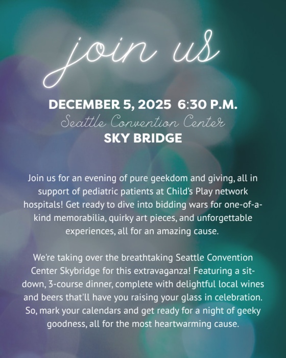 This is just a quick post to remind folks that the annual Child's Play charity dinner and auction is coming up on December 5th and you can get your tickets right here. The big news this year is that Jerry and I are returning to the stage to host the evening and serve as your terrible auctioneers!